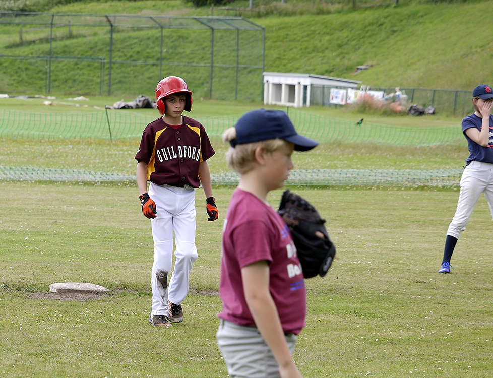 The on an off weather of this summer, was not going to dampen spirits, and Game 1 was very close, with Guildford taking an early 2-0 lead, behind Aiden’s pitching, and Brighton tying it up, by the 3rd inning. With a 4 run inning slaughter rule which made the game very comeptitive and kept the scoreline close.