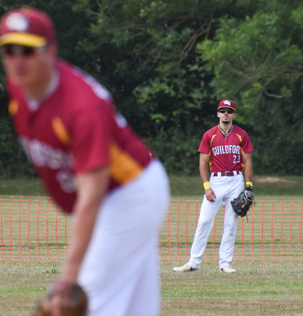 In the top of the fifth, Guildford came out with a focused determination. With a new pitcher on the mound for Brighton, Owen M walked after the first two had struck out, followed by Oscar, and both moved up on a wild pitch. Harry then grounded to the shortstops back hand for what would have driven  in a run on a difficult play, but unfortunately Oscar was caught between the bases, and tagged out before the run had crossed to end the inning.